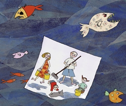 在《海盜假期》一書中,安緹葉‧達姆除了持續發揮擅用拼貼的技巧外,更讓孩子發揮想像力,來場紙上冒險之旅。甚至,不忘在蝴蝶頁的小線索裡,展現出她對於孩子的接納。