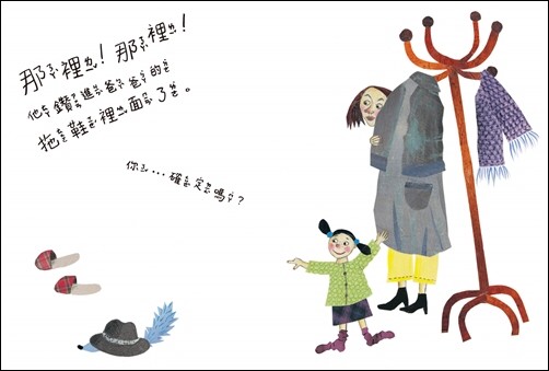 世界上究竟有沒有鬼?當然有!就有一個坐在櫃子上,只是媽媽根本看不到!櫃子上沒有,洗衣機裡沒有,床上和橡膠樹裡也都沒有。但是,就有一個鬼坐在她的頭上……。是嗎?我怎麼都沒有感覺?我根本就沒看到什麼鬼嘛!那當然囉,難道妳不知道,鬼是看不到的嗎?